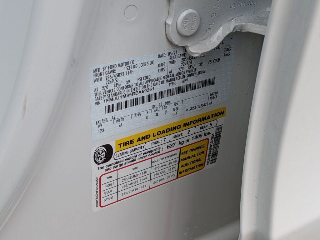 Handsfree Phone and Audio, Remote Start System, 2nd Row Captain Seats, Power Deploy Running Boards, Ambient Lighting, Power Folding Third Row Seat, 360-Degree Camera, Wireless Charging Pad, Ford Co-Pilot 360, Hotspot Telematics Modem, Expedition Platinum, 4D Sport Utility, EcoBoost 3.5L V6 GTDi DOHC 24V Twin Turbocharged, 10-Speed Automatic, 4WD, White Metallic, Light Sandstone Leather, 22 Speakers, 360-Degree Camera w/Trailer Reverse Guidance, Adaptive suspension, Adjustable pedals, Auto High-beam Headlights, Auto-dimming Rear-View mirror, Automatic temperature control, Brake assist, ControlTrac w/3.73 Axle Ratio, Dual front impact airbags, Dual front side impact airbags, Emergency communication system: SYNC 4 911 Assist, Equipment Group 600A Standard Package, Exterior Parking Camera Rear, Ford BlueCruise 1.0, Front dual zone A/C, Front fog lights, Front Tow Hooks, Fully automatic headlights, Garage door transmitter, Heated front seats, Heated rear seats, Heated steering wheel, Heated/Ventilated Prem Lthr Front Captain's Chairs, Heavy-Duty Trailer Tow Package, Illuminated entry, Integrated Trailer Brake Controller, Low tire pressure warning, Memory seat, Navigation system: Connected Navigation, Occupant sensing airbag, Overhead airbag, Pedal memory, Power driver seat, Power Liftgate, Power moonroof, Power passenger seat, Pro Trailer Backup Assist, Radio: B&O Unleashed Sound System by Bang & Olufsen, Rain sensing wipers, Rear air conditioning, Remote keyless entry, SiriusXM w/360L, Speed-sensing steering, Speed-Sensitive Wipers, Steering wheel memory, Steering wheel mounted audio controls, SYNC 4 w/Enhanced Voice Recognition, Telescoping steering wheel, Tilt steering wheel, Variably intermittent wipers, Ventilated front seats, Wheels: 22 6-Spoke Polished Aluminum.