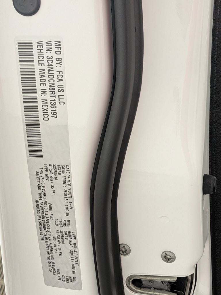Drowsy Driver Detection, Fog and Cornering Lamps, Handsfree Phone and Audio, Rear-Seat Reminder Alert, Remote Start System, Windshield Wiper De-Icer, Active Lane–Management System, Full–Speed Forward–Collision Warning Plus, ParkSense Rear Park–Assist with Stop, Blind–Spot and Cross–Path Detection, Advanced Brake–Assist, Apple CarPlay, Google Android Auto, Adaptive Cruise Control with Stop and Go, Pedestrian / Cyclist Emergency Braking, Compass Limited, 4D Sport Utility, 2.0L I4 DOHC, 8-Speed Automatic, 4WD, Bright White Clearcoat, Black Artificial Leather, 10.1 Touchscreen Display, 4G LTE Wi-Fi Hot Spot, Auto High-beam Headlights, Auto-dimming Rear-View mirror, Automatic temperature control, Brake assist, Dual front impact airbags, Dual front side impact airbags, Emergency communication system: Jeep Connect, Front dual zone A/C, Front fog lights, Fully automatic headlights, Heated front seats, Heated steering wheel, Illuminated entry, Integrated Voice Command w/Bluetooth®, Knee airbag, Leatherette Seats, Low tire pressure warning, Occupant sensing airbag, Overhead airbag, ParkView Rear Back-Up Camera, Power driver seat, Rain sensing wipers, Remote keyless entry, SiriusXM Radio Service, Steering wheel mounted audio controls, Telescoping steering wheel, Tilt steering wheel, Variably intermittent wipers, Wheels: 18 x 7 Painted Diamond Cut Aluminum.